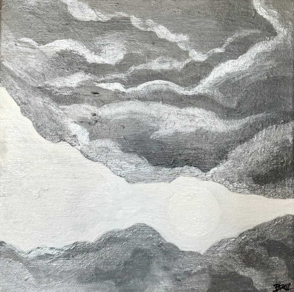 February Sky captures a fleeting moment of winter’s atmospheric mood with both honesty and quiet optimism. Painted in 10″ x 10″ acrylic and engaging directly with the often gray and subdued skies that hover at altitude in February, a dreary scene turns into an evocative study of subtle light and shifting tone. Rather than merely reproducing the sky as it appeared, texture and mood is translated into a visual meditation—where whispering hues and soft transitions suggest the promise of change just beyond the horizon.